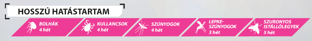 A FRONTLINE® TRI-ACT repellens hatással bír a szúnyogok, lepkeszúnyogok és szuronyos istállólegyekkel szemben. Szuronyos istállólégy és lepkeszúnyogok ellen rovarölő hatással is rendelkezik.